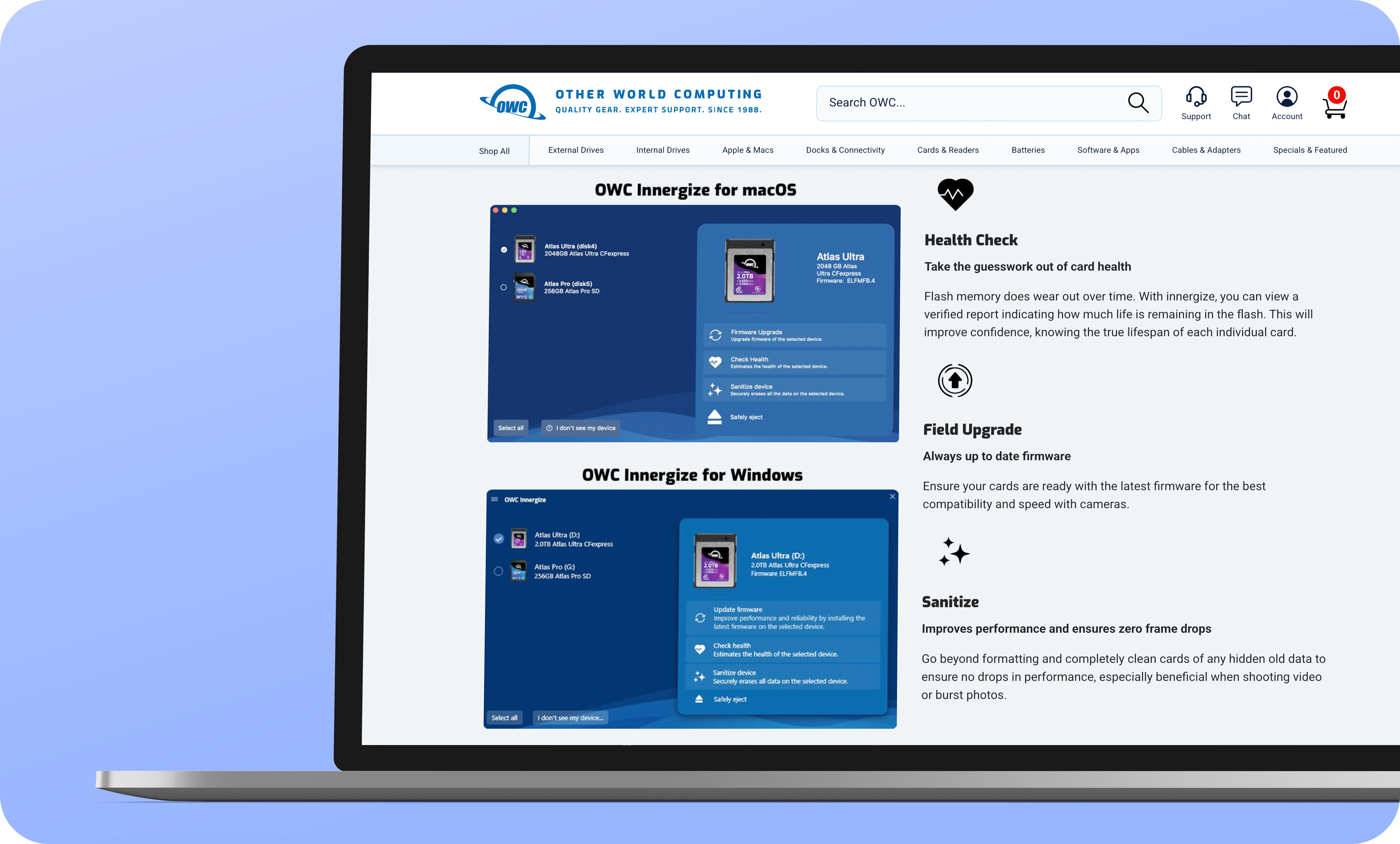 Once all the labels were created, the wave design and color hex codes were handed off to bring the new Atlas branding to other deliverables. Deliverables including: web pages, memory card software Innergize, and Amazon gallery images.