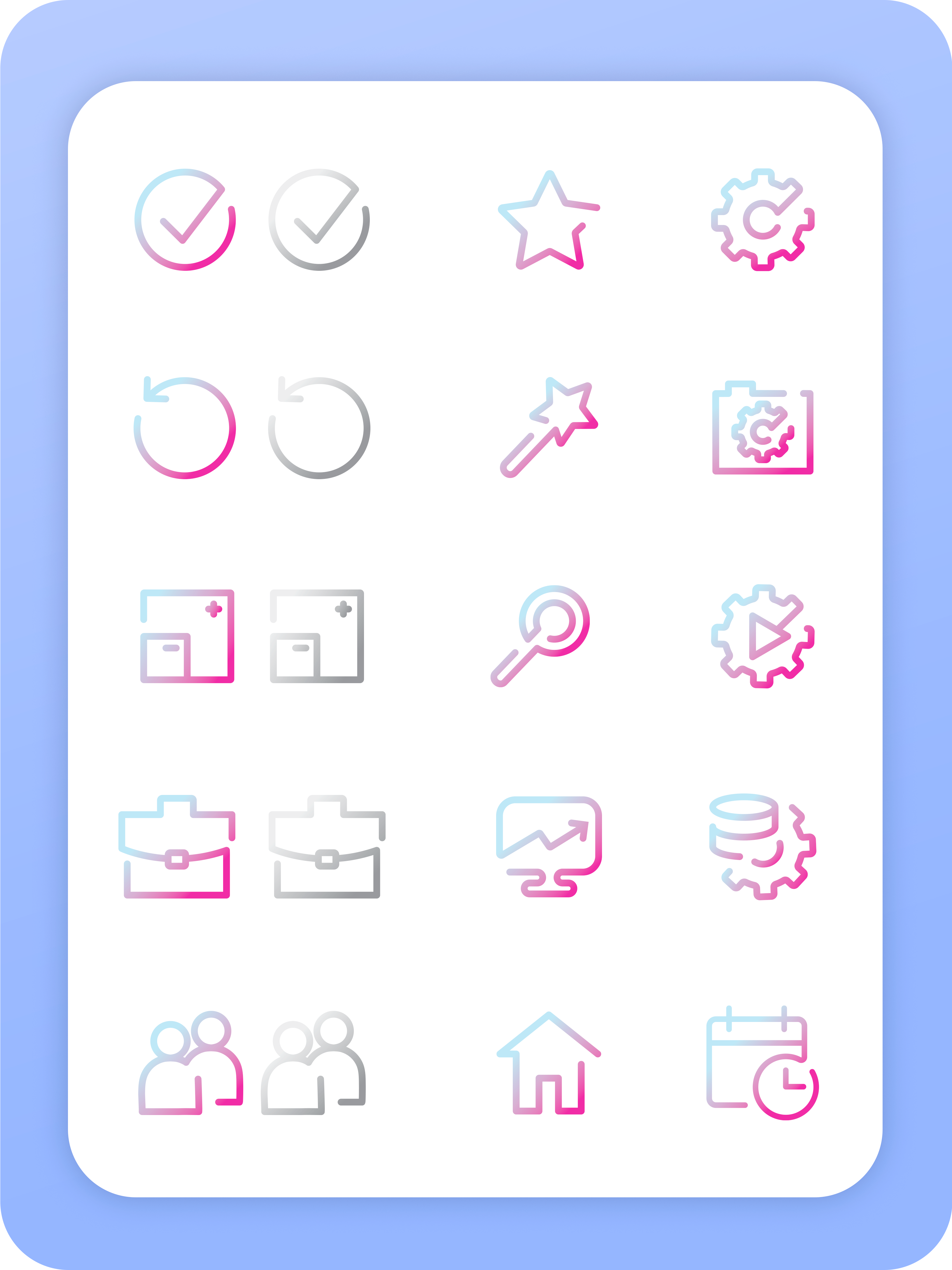 Column one shows the icons in greyscale and color gradient. The idea was once an icon section was selected it would change to the blue/pink gradient, which replicates the gradient in the logo swoop.
