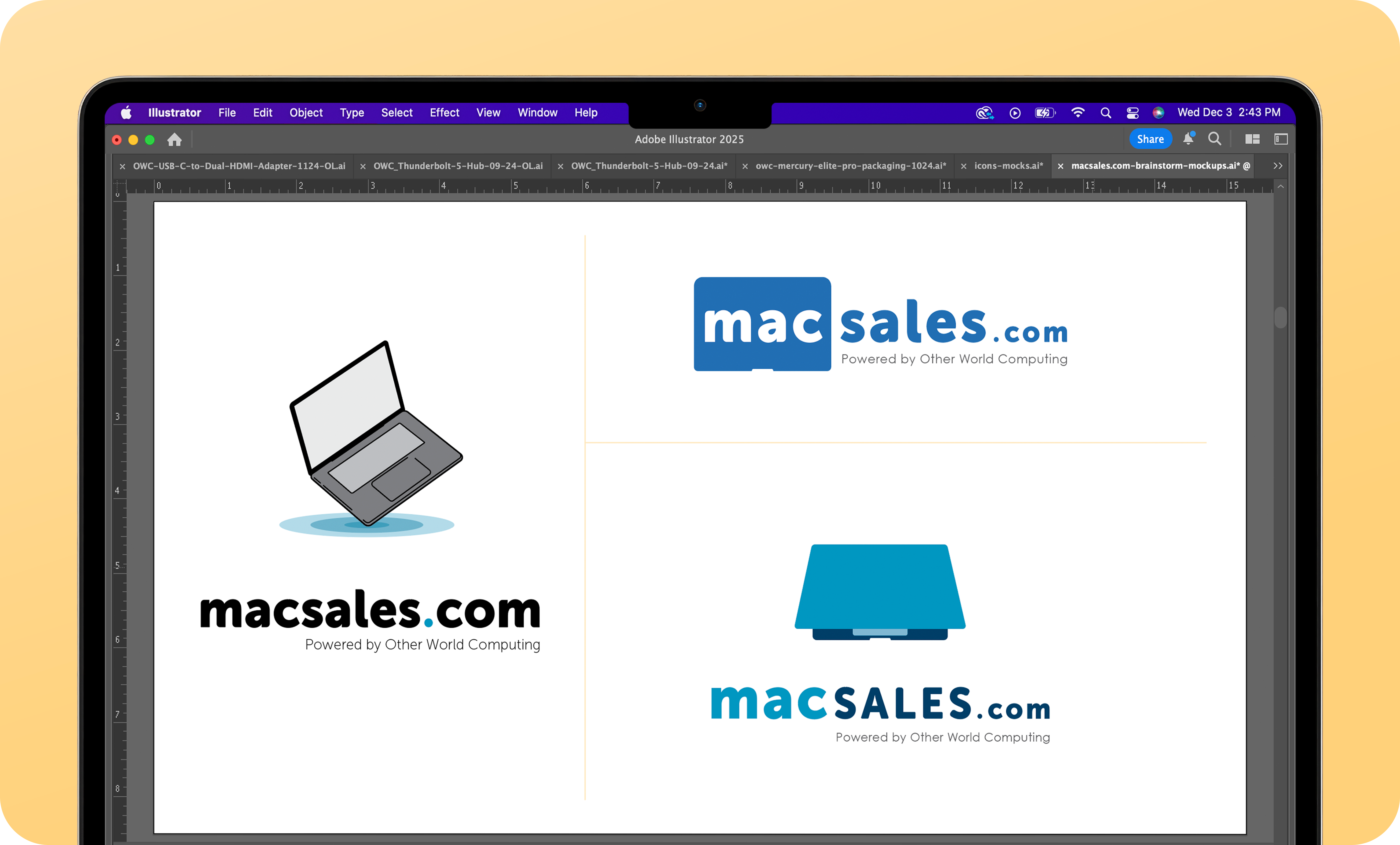 Create a new logo for macsales.com that includes, in full, "macsales.com" to avoid any copyright infringement with Apple, as well as, "An Other World Computing company". Can also include an icon, new colors, and new fonts.